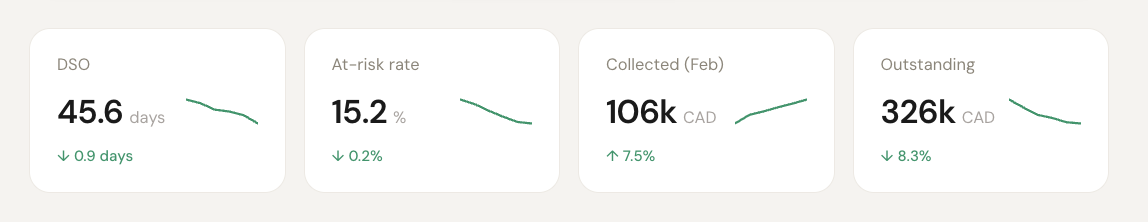 Monitor recovery rates, DSO, and at-risk invoices from your dashboard so you always know where your receivables stand.